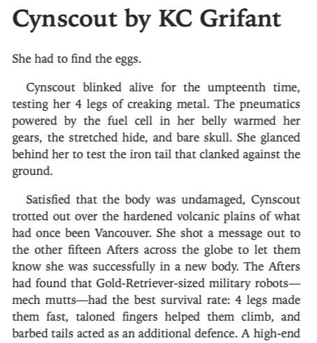 “Cynscout” is about a fused owner-and-pet consciousness trying to survive the apocalypse and carry out their grim mission to usher in the end of the world. You can read an excerpt below.