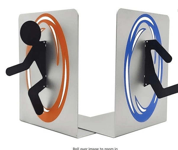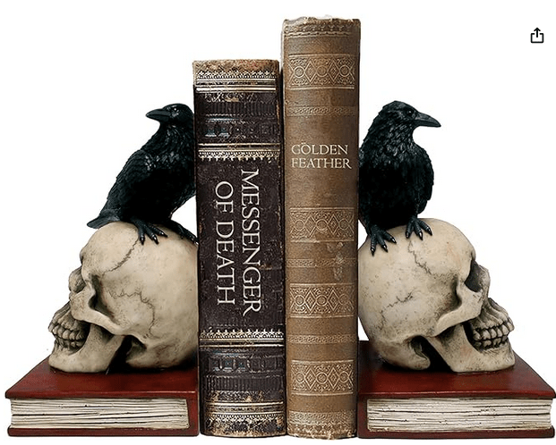 Two of my favorite bookends that have held up to the test of time (and loads of book weight) are the Portal bookends (which always evoke comments from guests) and the raven and skull bookends. A bookend tip: while the single slanted book holders look cool, in practice I’ve found they do a poor job of actually holding up a book.