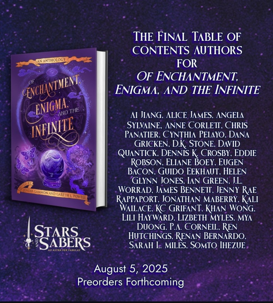 If horror isn’t your thing but you still want to support great storytelling, good news: pre-orders are now open for Of Enchantment, Enigma, and the Infinite. This magical-themed anthology is filled with spellbinding tales, including “Beneath scorching sand, above metal sun,” my story about a desperate railroad worker in the Weird West who turns to forbidden sorcery to save his friend. It’s a gritty surreal story about loyalty, sacrifice and the costs of power.