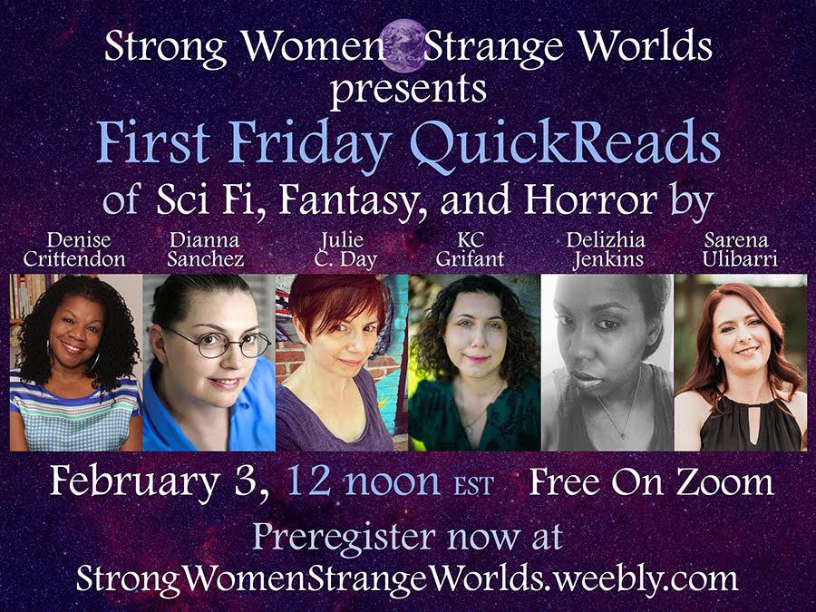 Presenting the “First Friday – Third Thursday Quick Reads Live Reading Series” via Zoom. Each virtual event features 6 authors, for 8 minutes each. A tasting menu of speculative fiction delights–you bring your refreshment, we bring the entertainment; a fresh selection at each event! Featuring Denise Crittendon, Julie C. Day, KC Grifant, Delizhia Jenkins, Dianna Sanchez, and Sarena Ulibarri. Recap link coming soon.