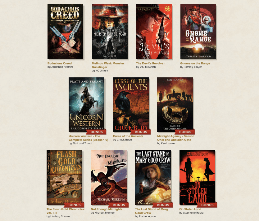 StoryBundle offers a very appealing deal for readers: for only $5 (or more, if you’re feeling generous), you’ll get the basic bundle of four digital books, details below. There is also an upgraded bundle where you can get **11** weird west stories for a deeper discount!